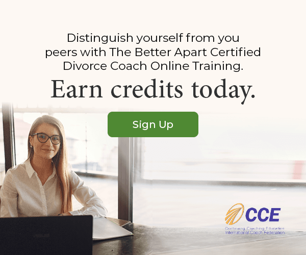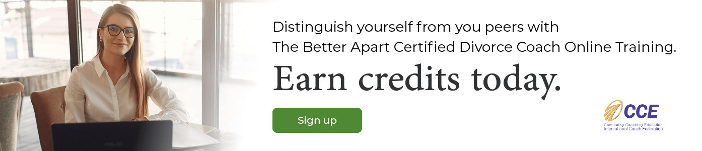 Move onto the Complete Better Apart Certified Divorce Coach Online program to access greater skills for your practice and your client. (ICF Coaches can earn up to 12 CCE credits)