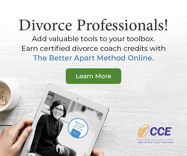 If you are a therapist, lawyer, coach, cdfa or other divorce professional looking to add actionable tools to your toolbox, and to create a practice that is both profitable and peaceful, The Better Apart Method Certified Divorce Coach program is for you. Your client can have a peaceful divorce and you can have a better practice. The Better Apart Divorce Coach Certification, is a powerful divorce coach training that will help you learn how to manage your divorce practice in a better way, with greater confidence and positivity and allow your client to survive and thrive through and beyond divorce.